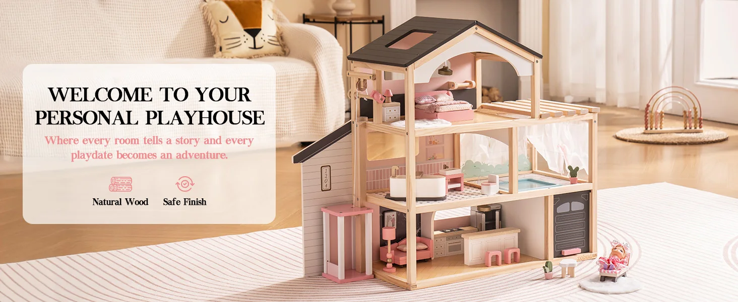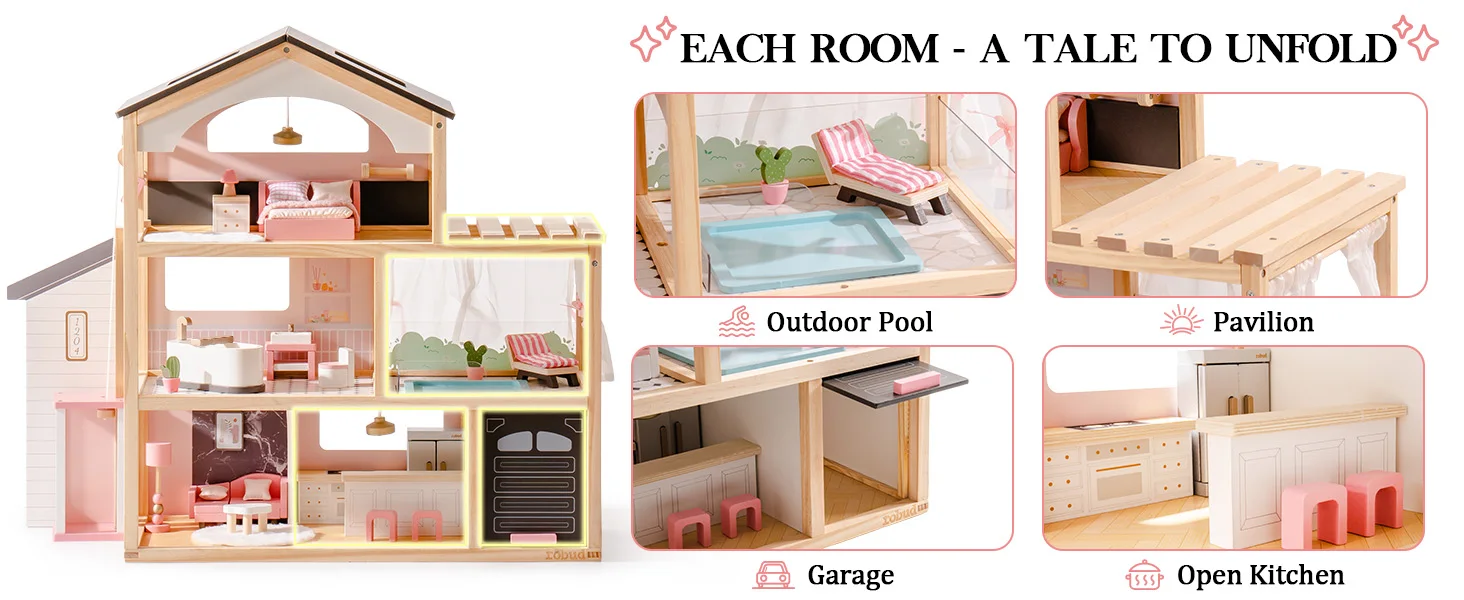 This spacious wooden dollhouse features multiple beautifully designed rooms, including a bedroom, bathroom, living area, kitchen, garage, elevator, and swimming pool. Fully furnished with detailed furniture, it encourages imaginative play and realistic role-playing. Crafted from durable wood for long-lasting enjoyment, it’s easy to assemble and makes an exceptional gift that creates unforgettable playtime moments.